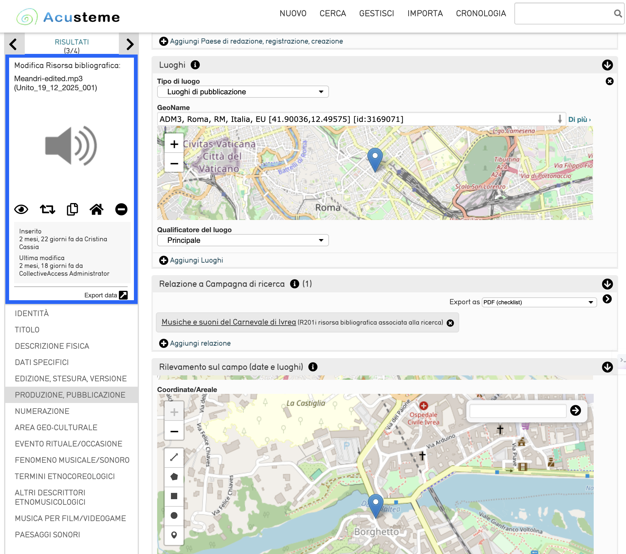 ACUSTEME Data Model – un modello di dati progettato per descrivere e organizzare materiali etnografici e sonori complessi, tenendo conto dei contesti performativi, rituali e sociali in cui essi emergono.